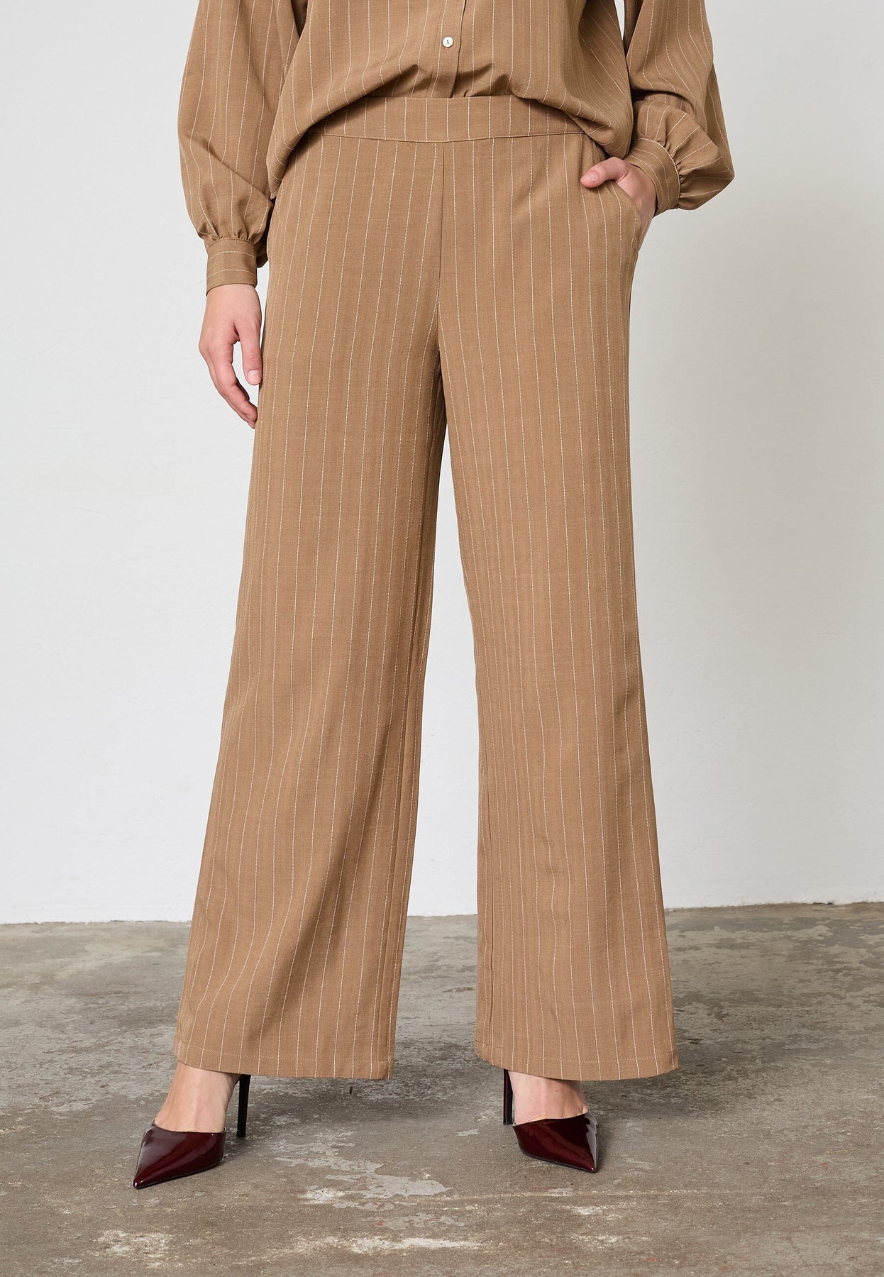 Brązowe spodnie w prążki od Sisters Point z szerokimi nogawkami i wysokim stanem. Spodnie odpowiednie na imprezy, na co dzień oraz na formalne okazje.
