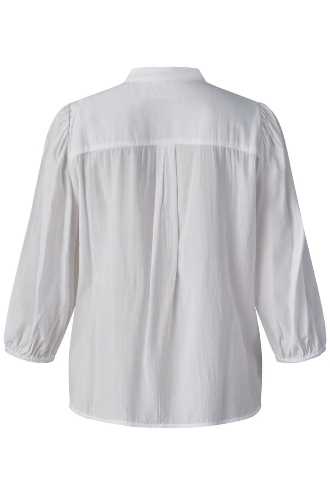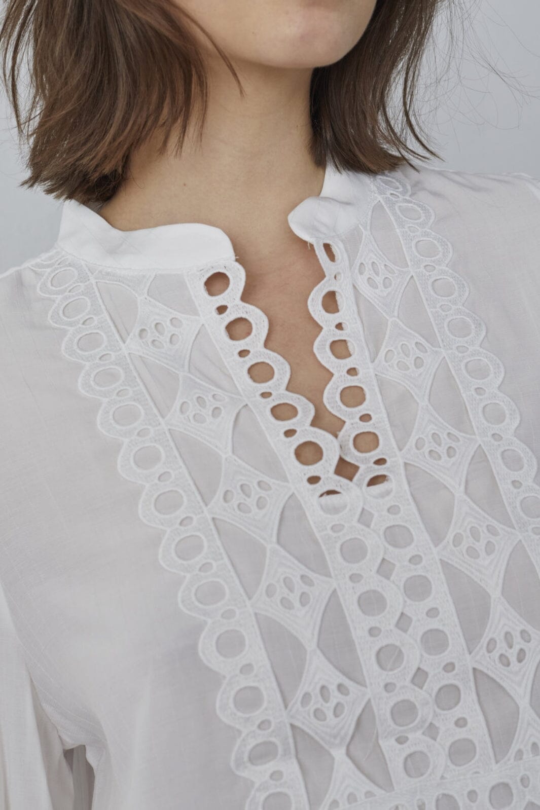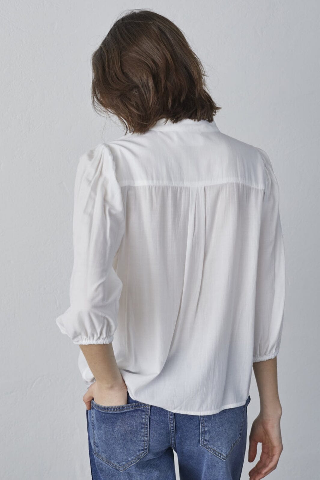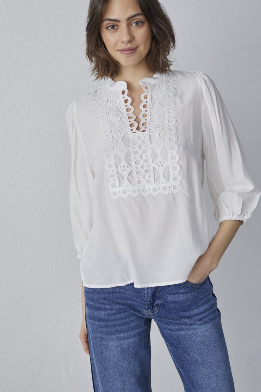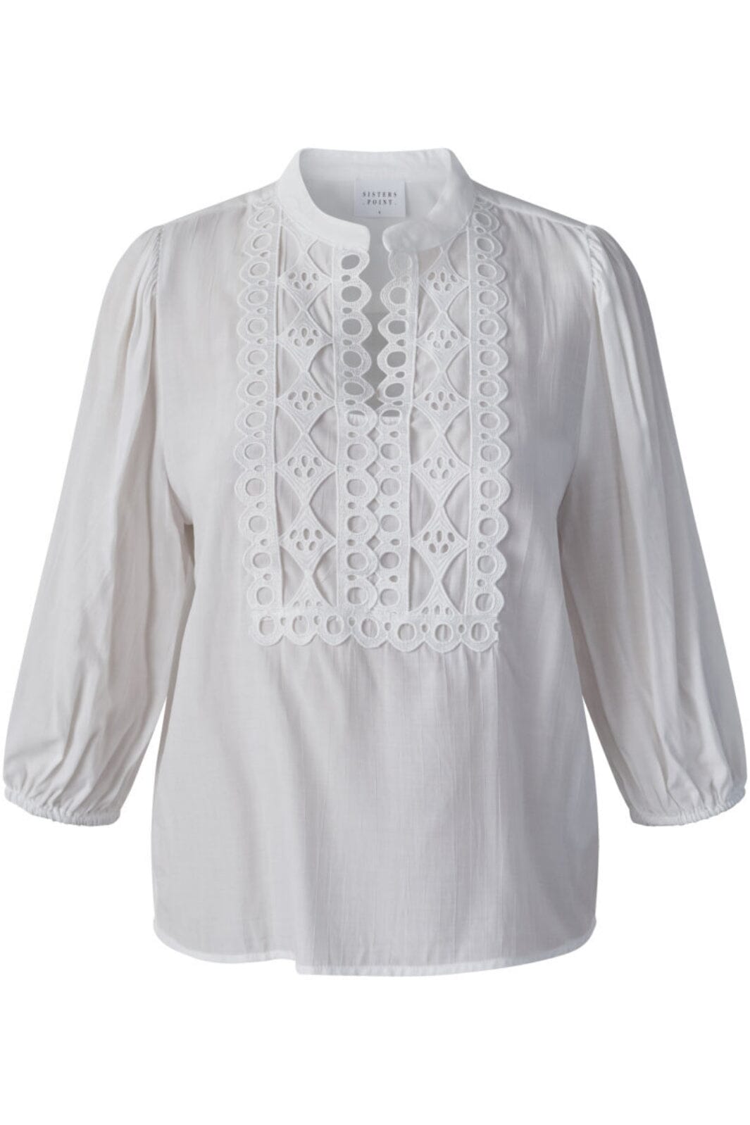 Kremowa bluzka od Sisters Point z koronkowymi detalami z przodu. Ma okrągły dekolt z zapięciem na guziki oraz 3/4 bufiaste rękawy z elastycznym wykończeniem.
