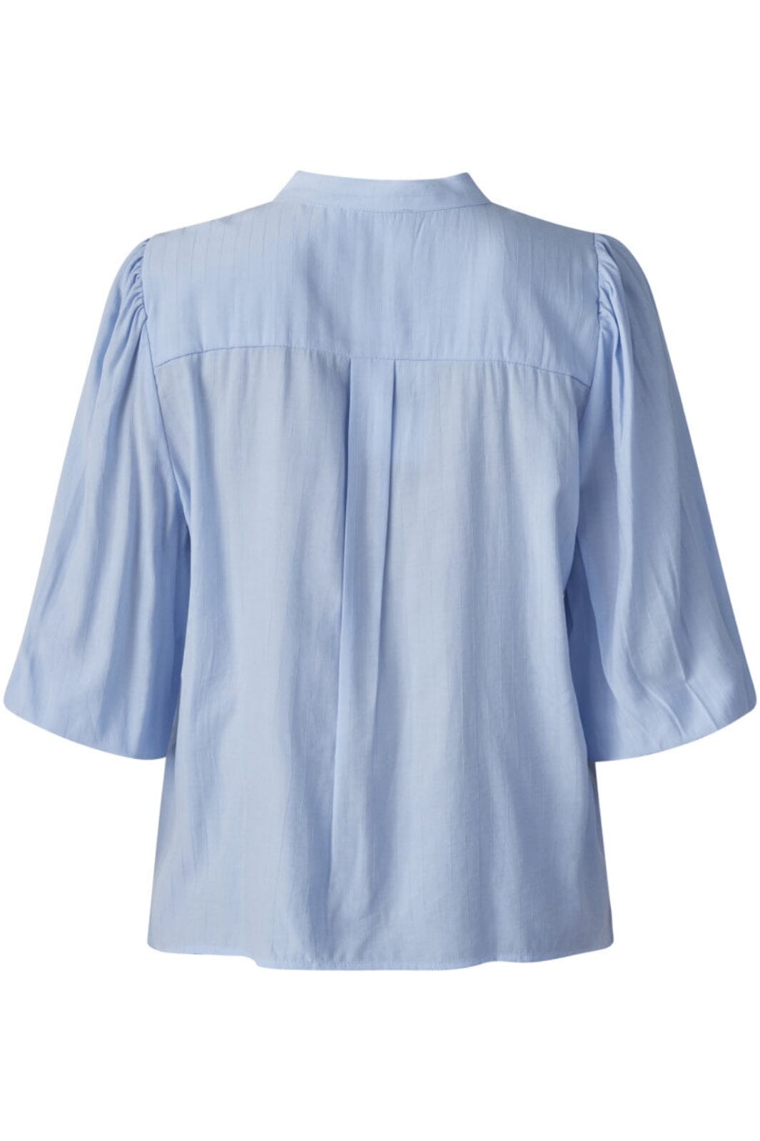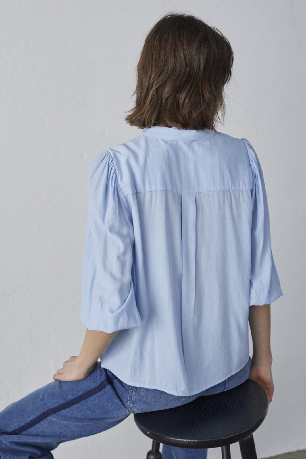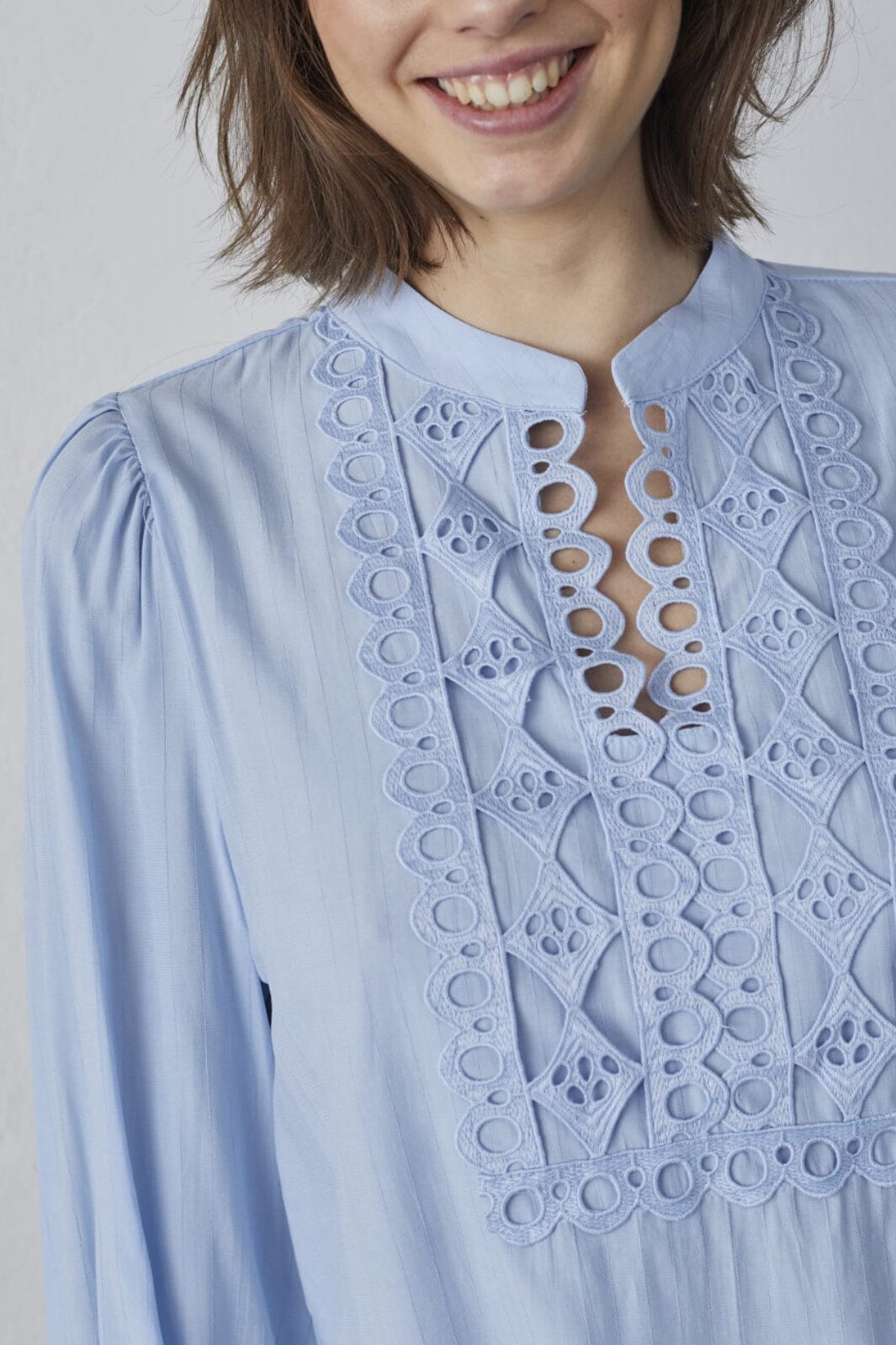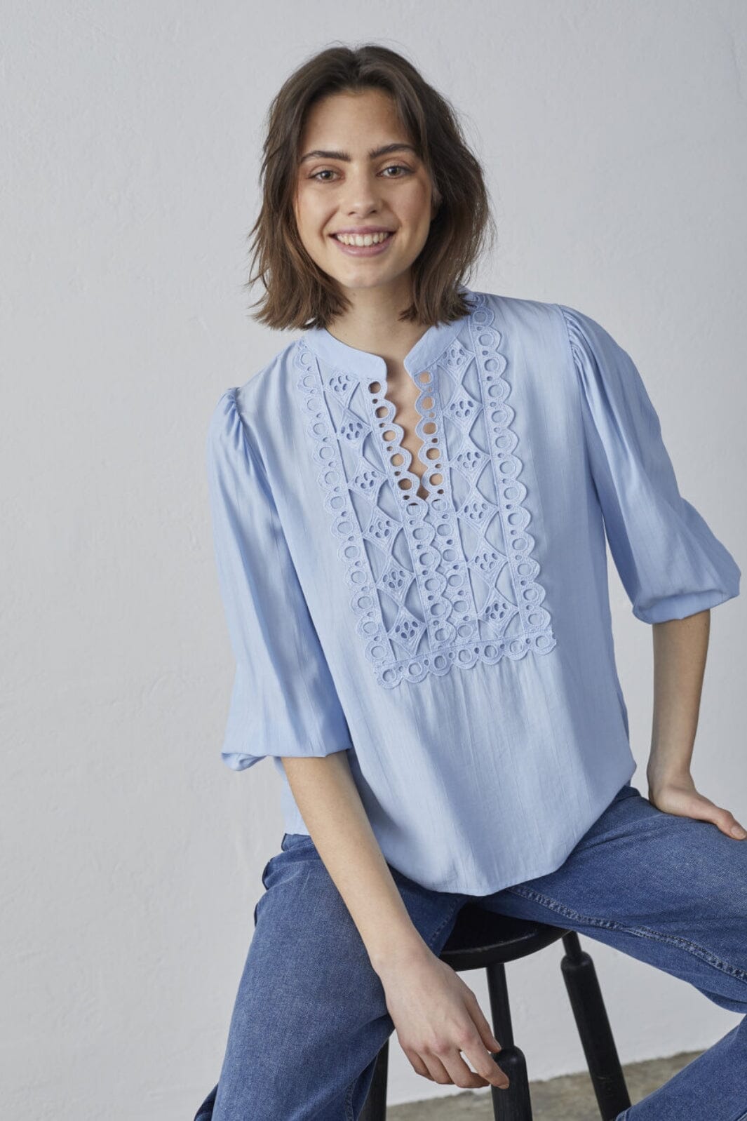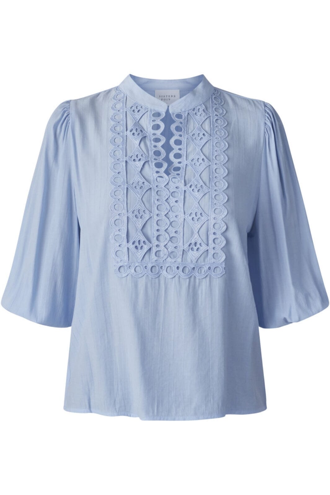 Jasnoniebieska bluzka od Sisters Point z koronkowymi detalami z przodu. Bluzka ma okrągły dekolt i rękawy 3/4 z bufkami na ramionach.