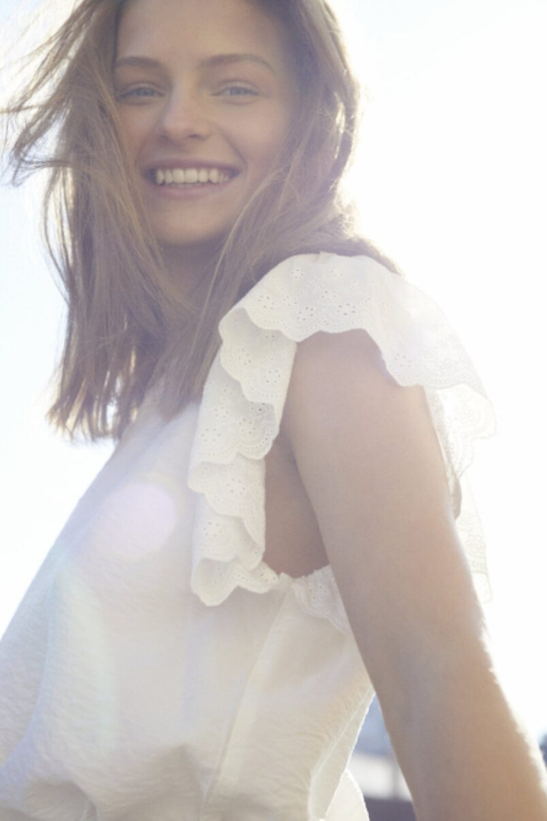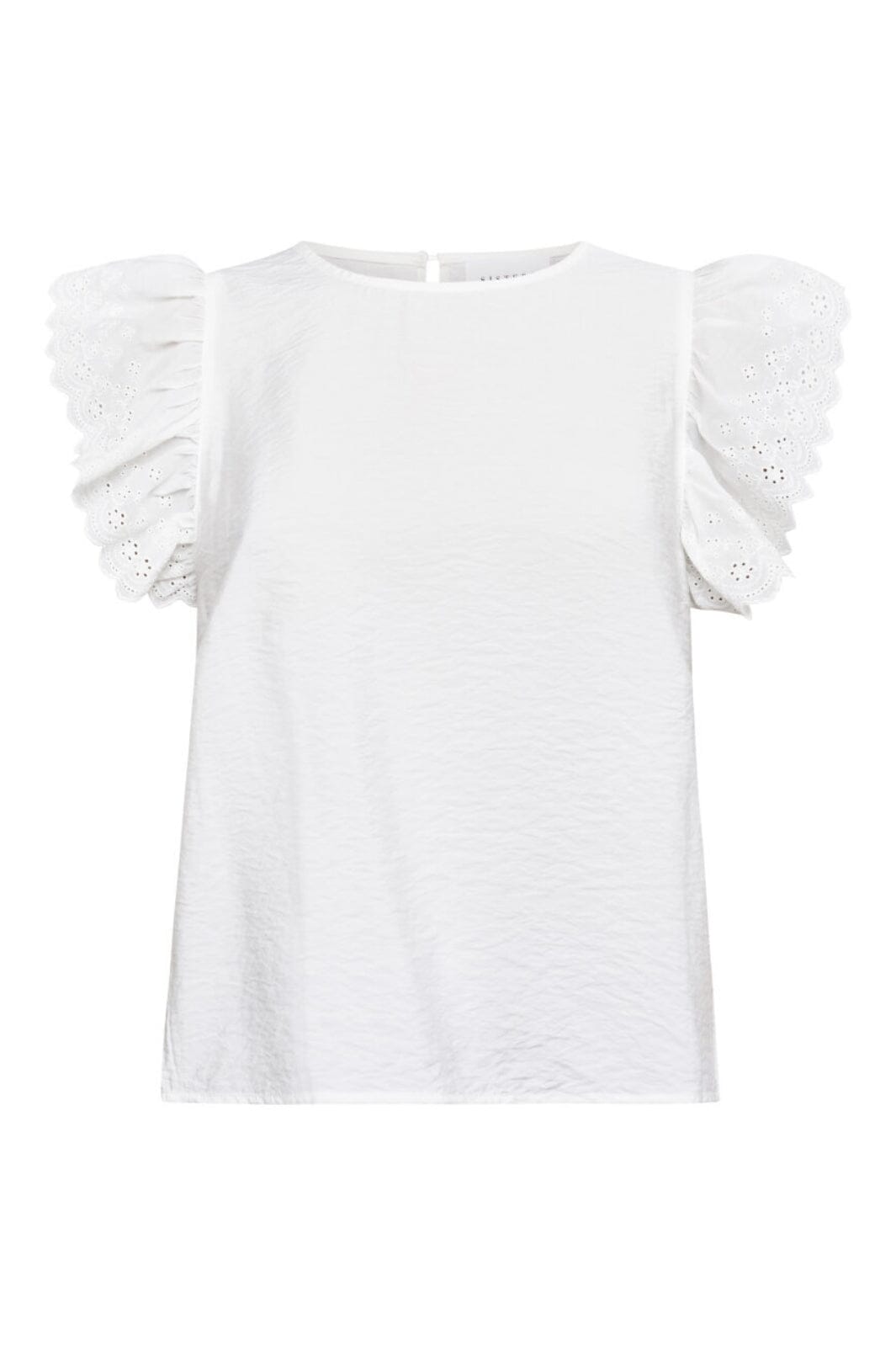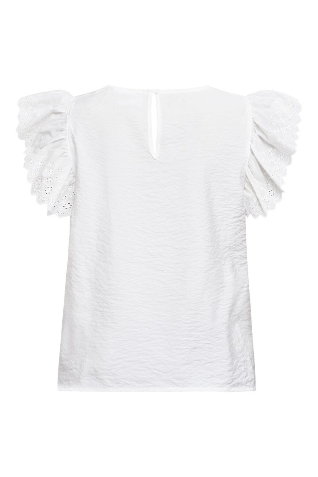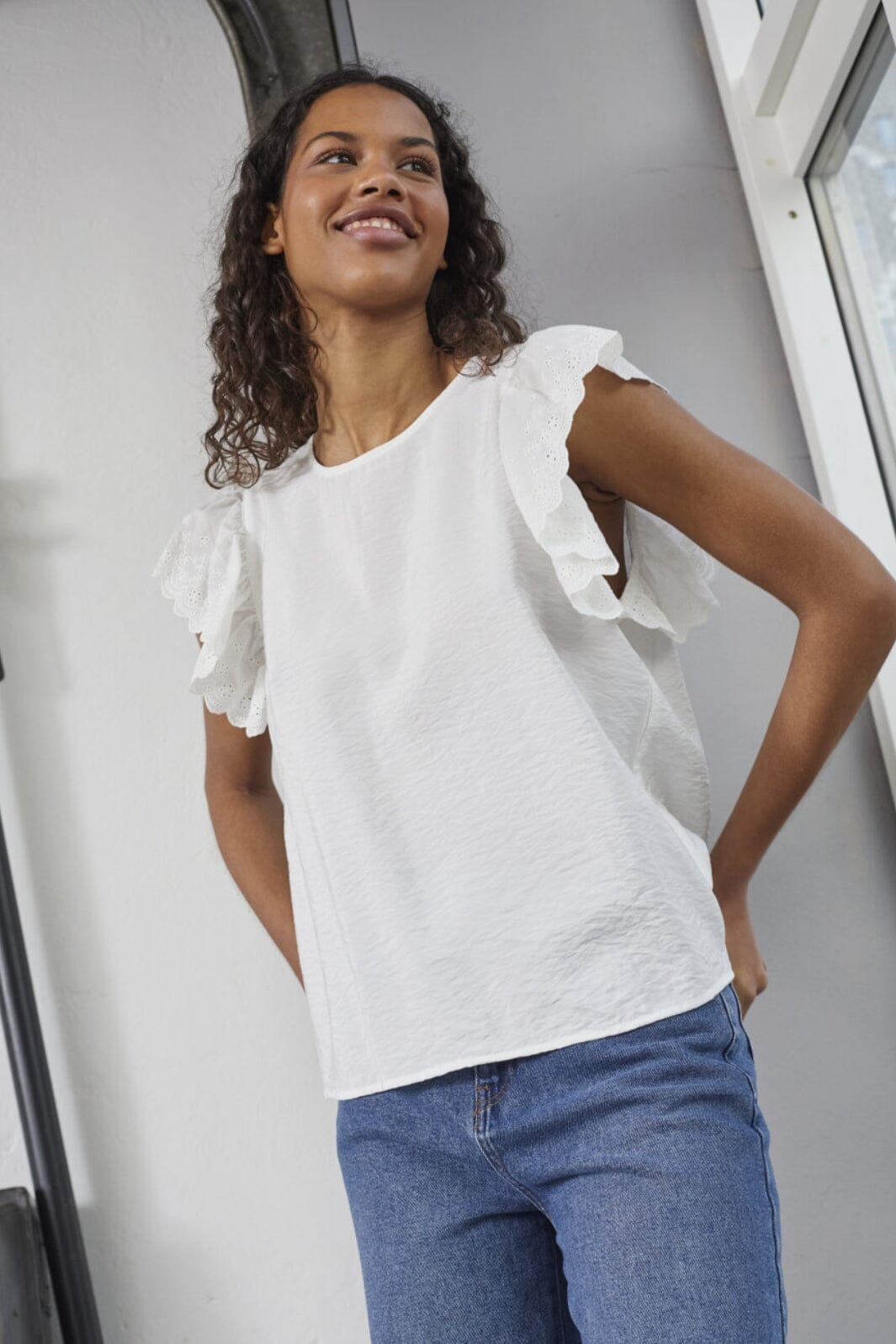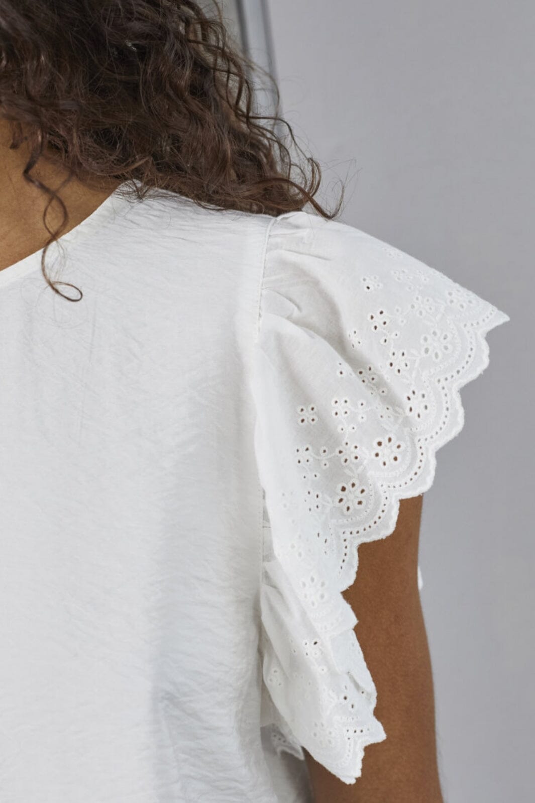 Biała bluzka od Sisters Point z falbankami i haftem anglaise na rękawach. Lekka bluzka z okrągłym dekoltem i krótkimi rękawami, która ma piękne ręcznie wykonane detale.