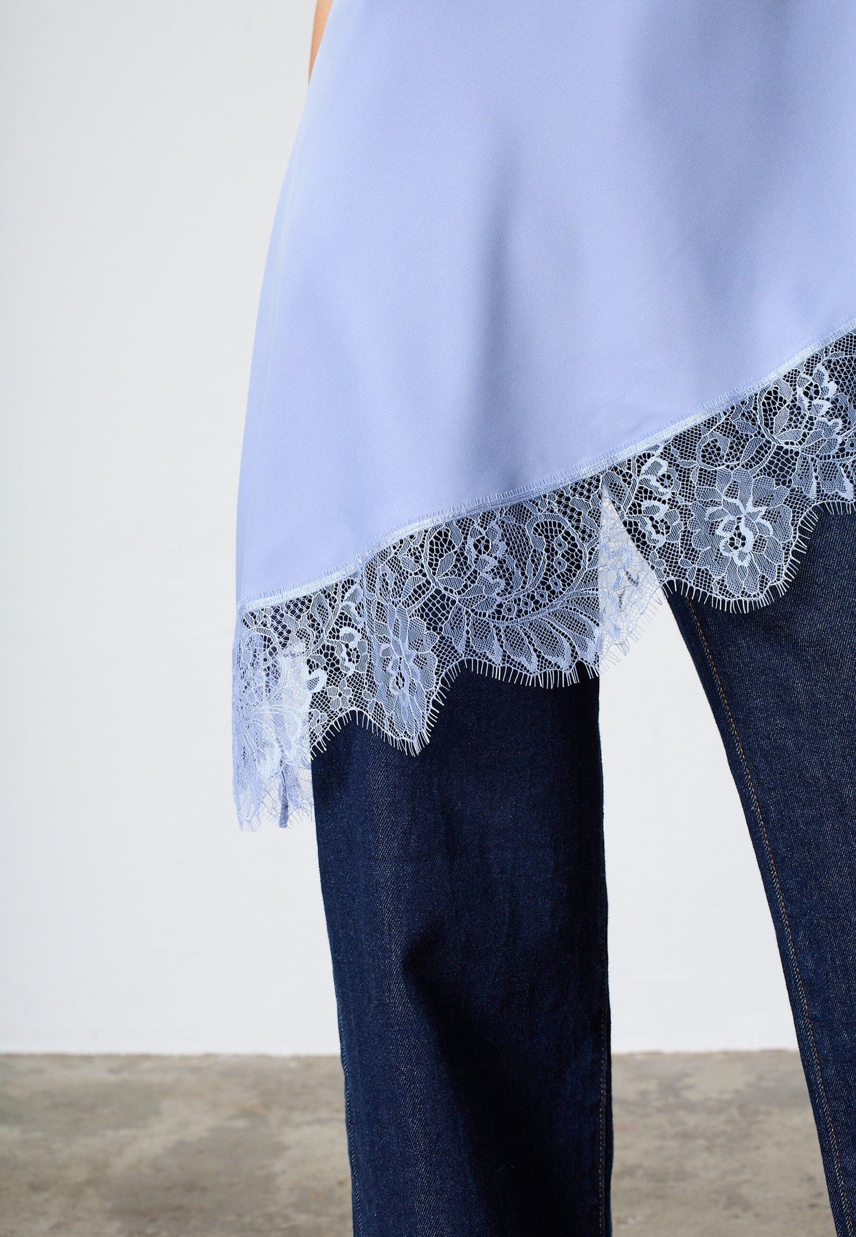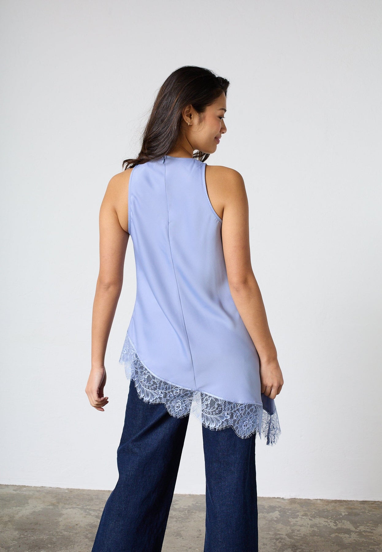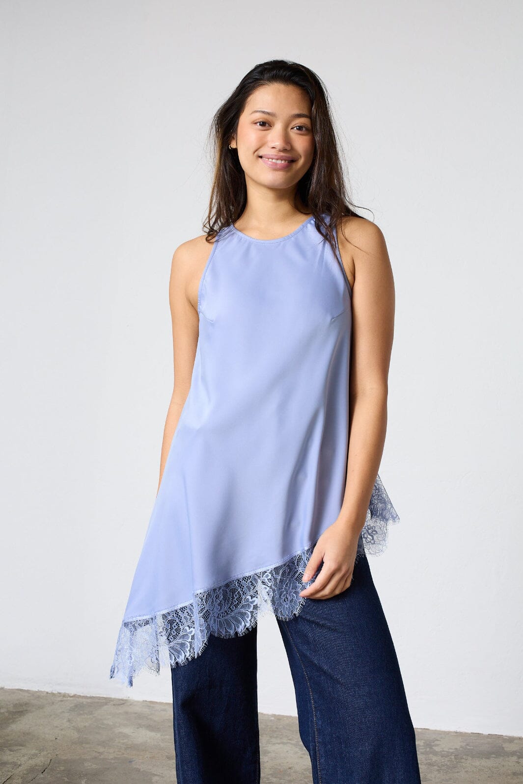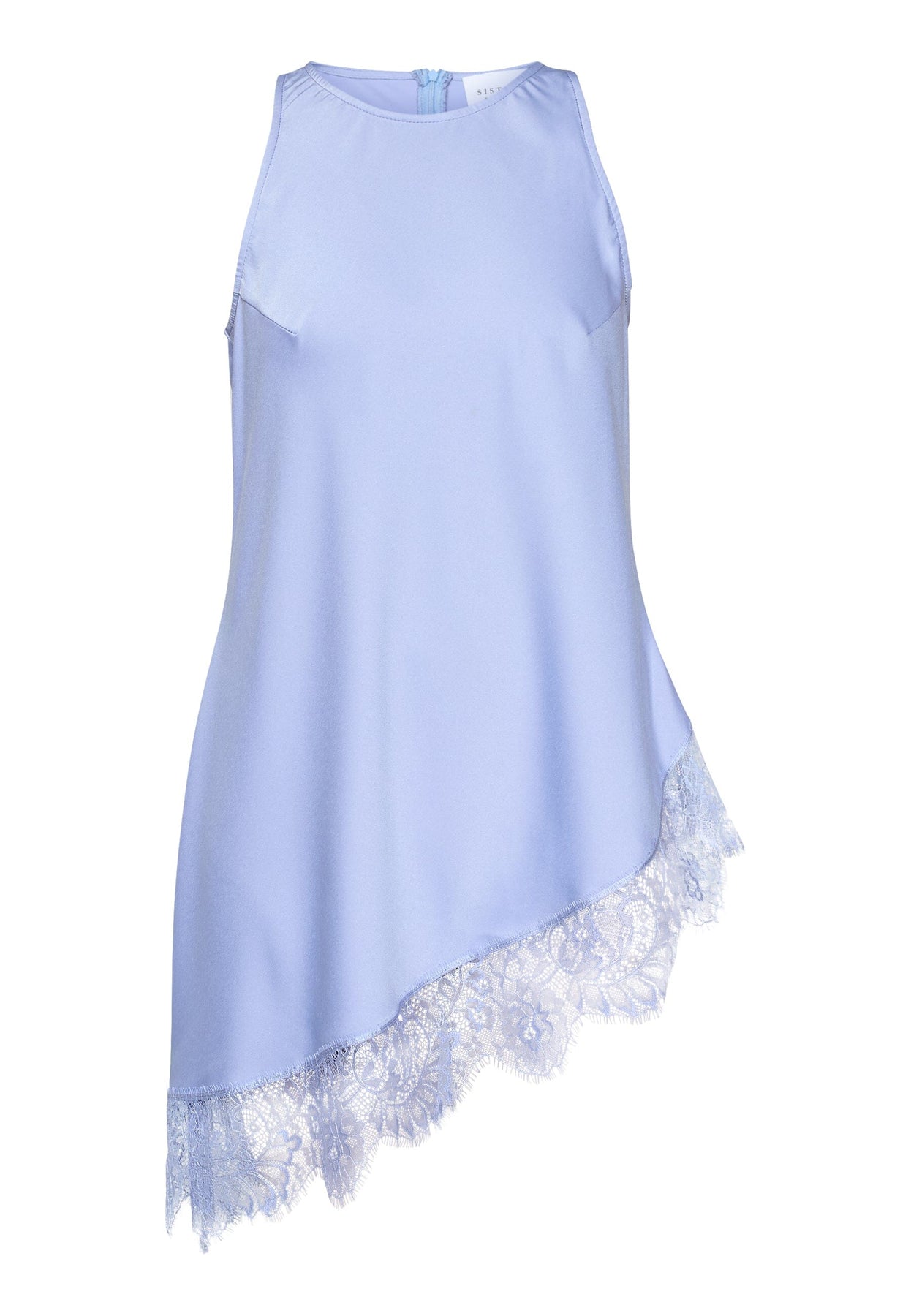 Średnioniebieski top od Sisters Point z satynowym wykończeniem i asymetrycznym dołem.