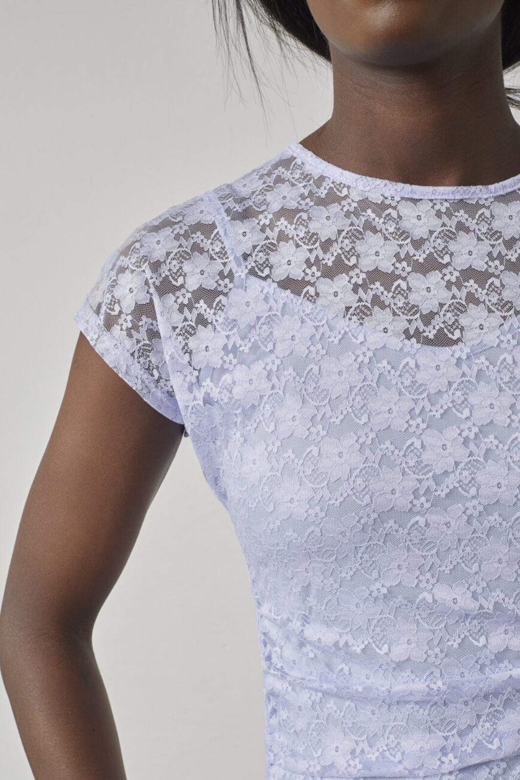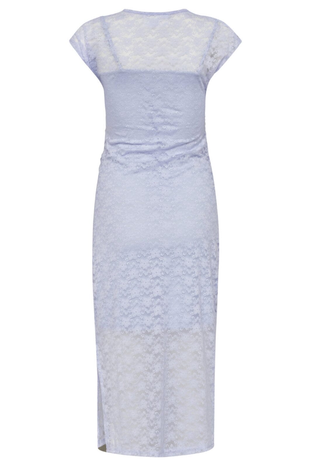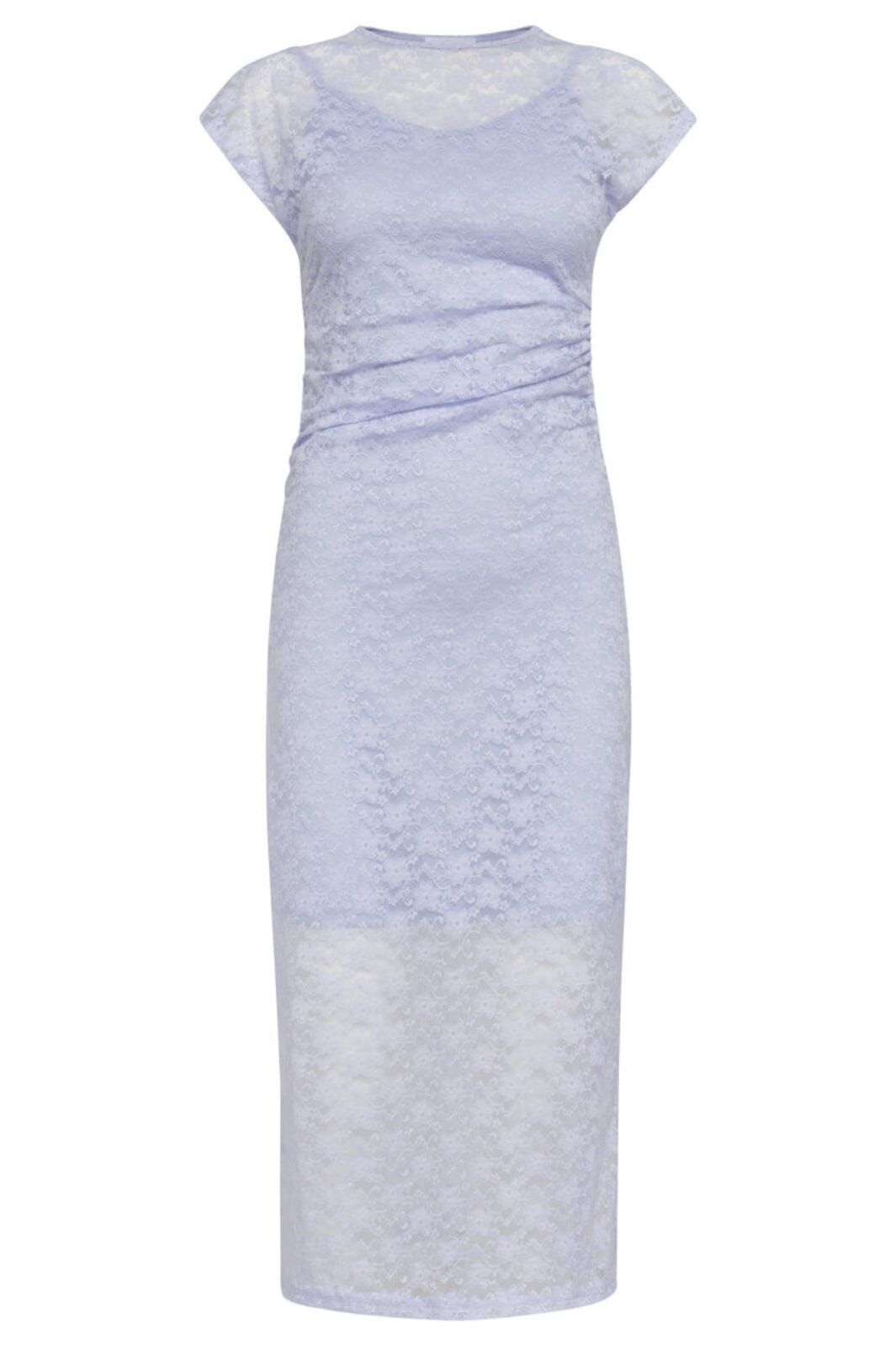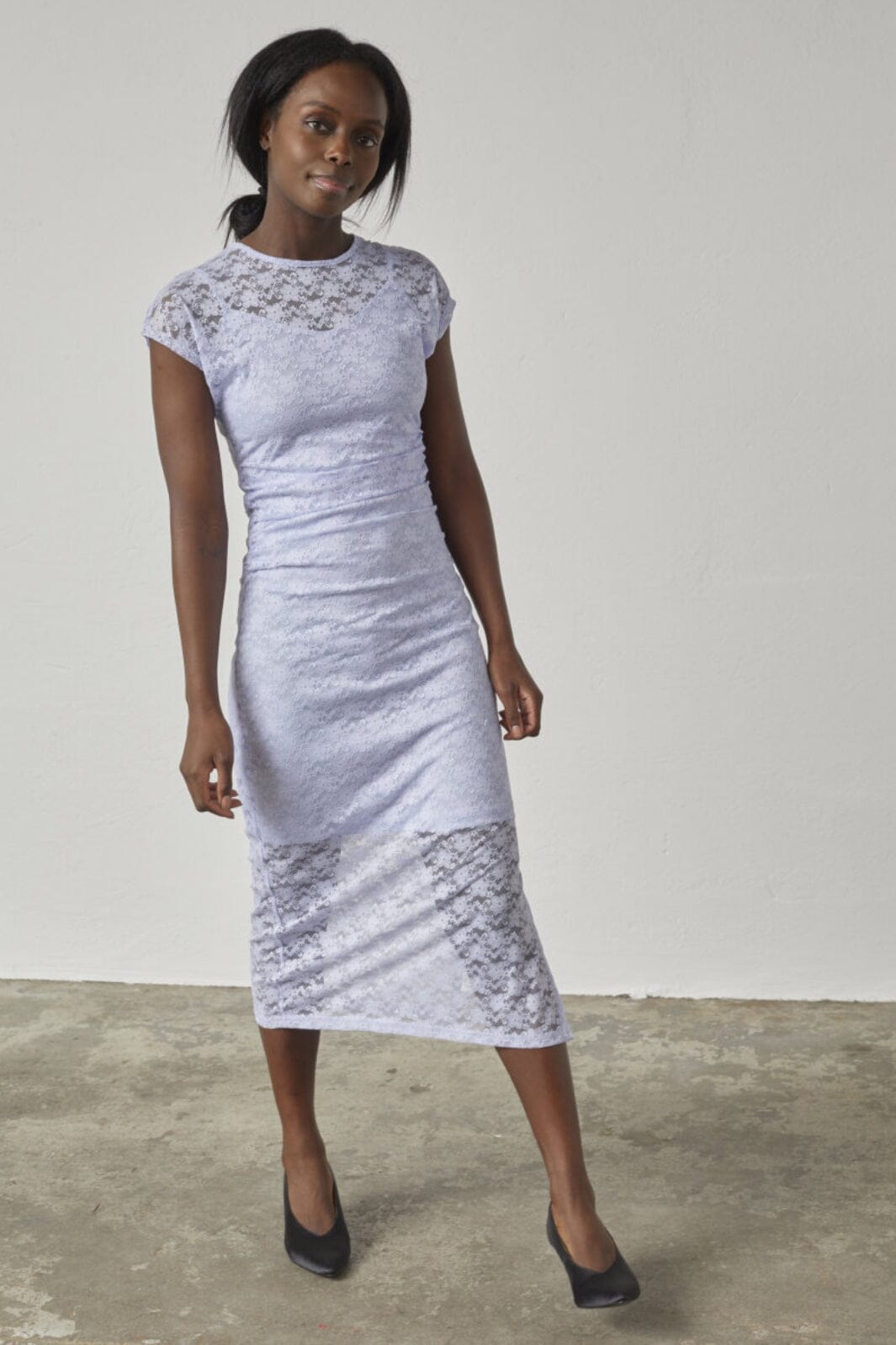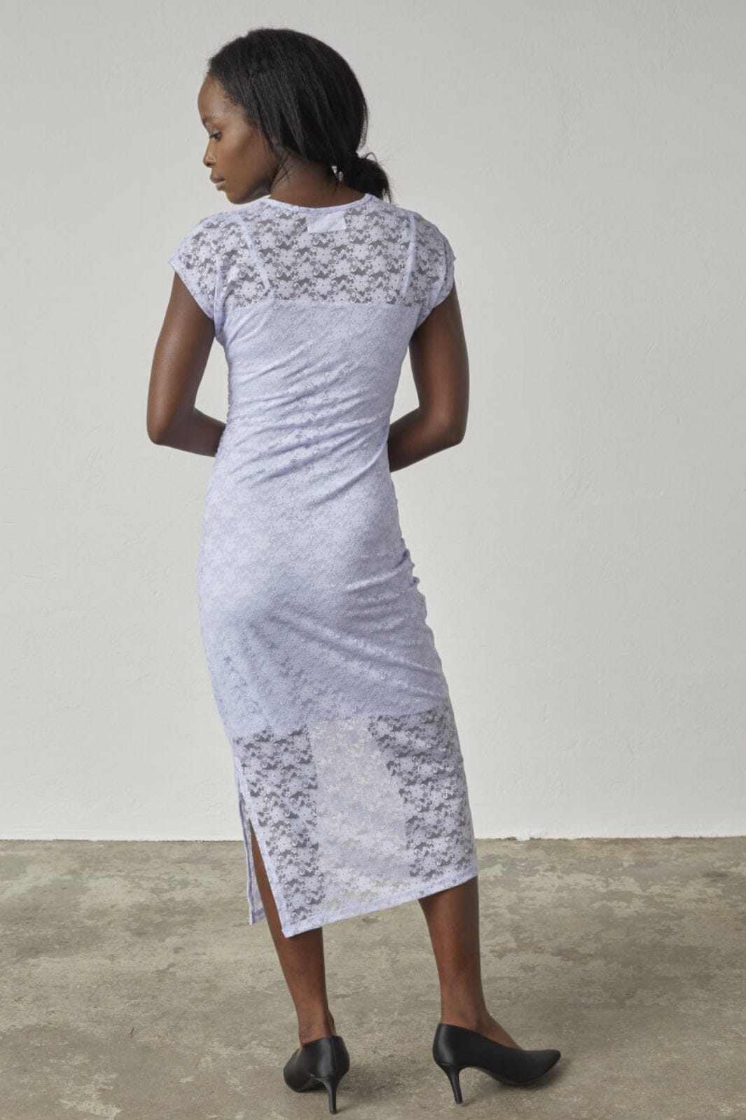 Koronkowa sukienka od Sisters Point w jasnolawendowym odcieniu. Sukienka ma okrągły dekolt i krótkie rękawy z przezroczystymi panelami koronkowymi. W zestawie znajduje się halka.