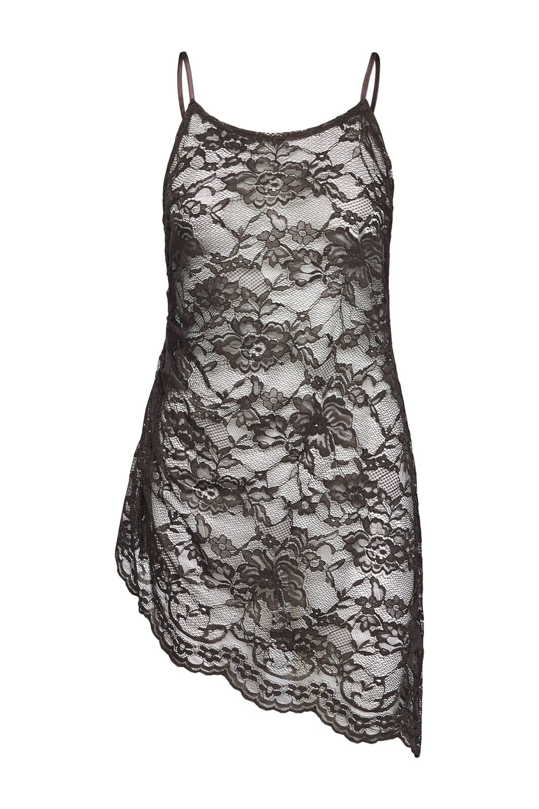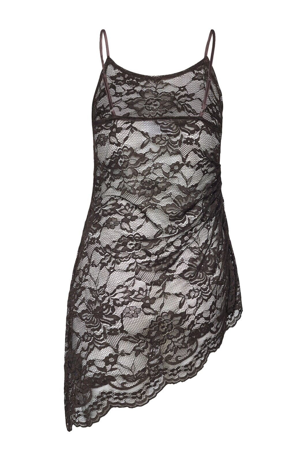 Koronkowa sukienka od Sisters Point w głębokim brązowym odcieniu. Sukienka jest przezroczysta i ma całkowicie pokrywający wzór kwiatowy z koronki.
