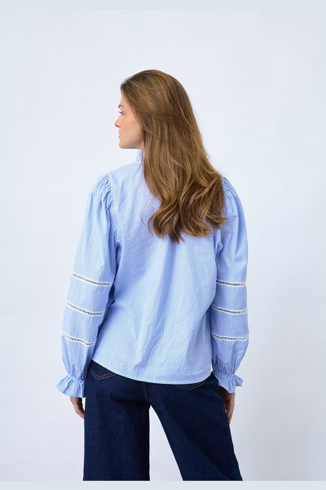 Bluzka od Sisters Point w niebiesko-białe paski. Bluzka jest typu pulower z wysokim dekoltem i długimi rękawami.