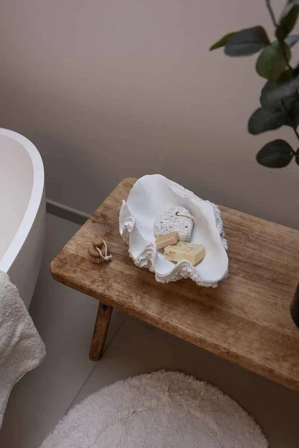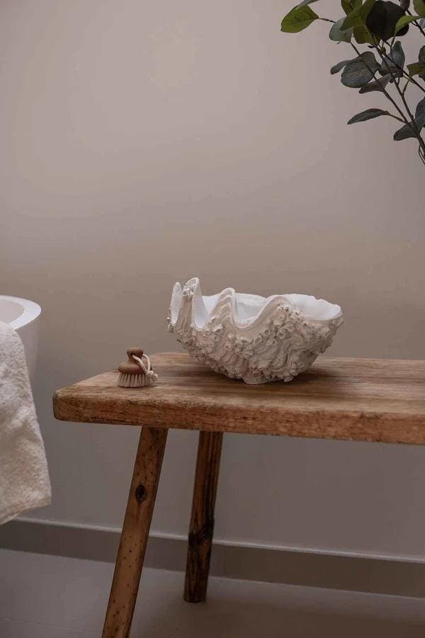 Biała miska od Specktrum w kształcie muszli. Posiada powierzchnię z naturalnymi wzorami i gładkie, błyszczące wnętrze. Miska łączy dekoracyjny styl z praktyczną funkcjonalnością.