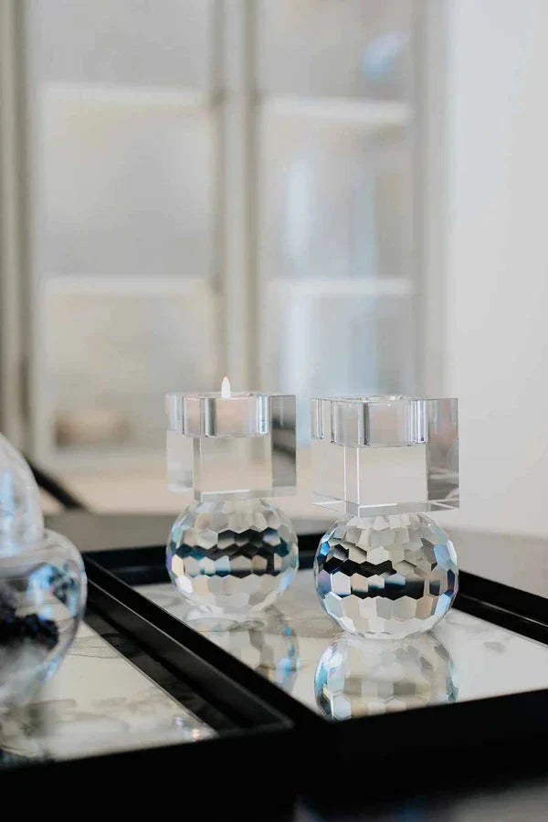 Świecznik marki Specktrum, wykonany z kryształowego szkła. Ma geometryczny kształt z fasetowaną podstawą i cylindryczną górą na podgrzewacze.