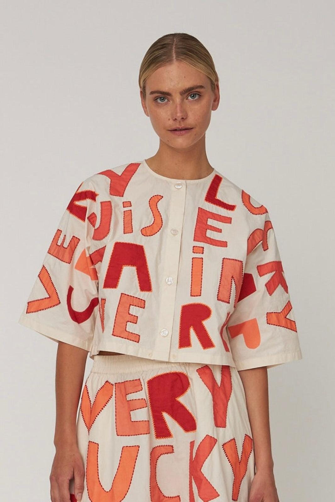 Koszula Stella Nova z nadrukowanym wzorem dużych liter w czerwonych i pomarańczowych odcieniach na jasnym tle. Koszula wykonana jest z bawełny organicznej.