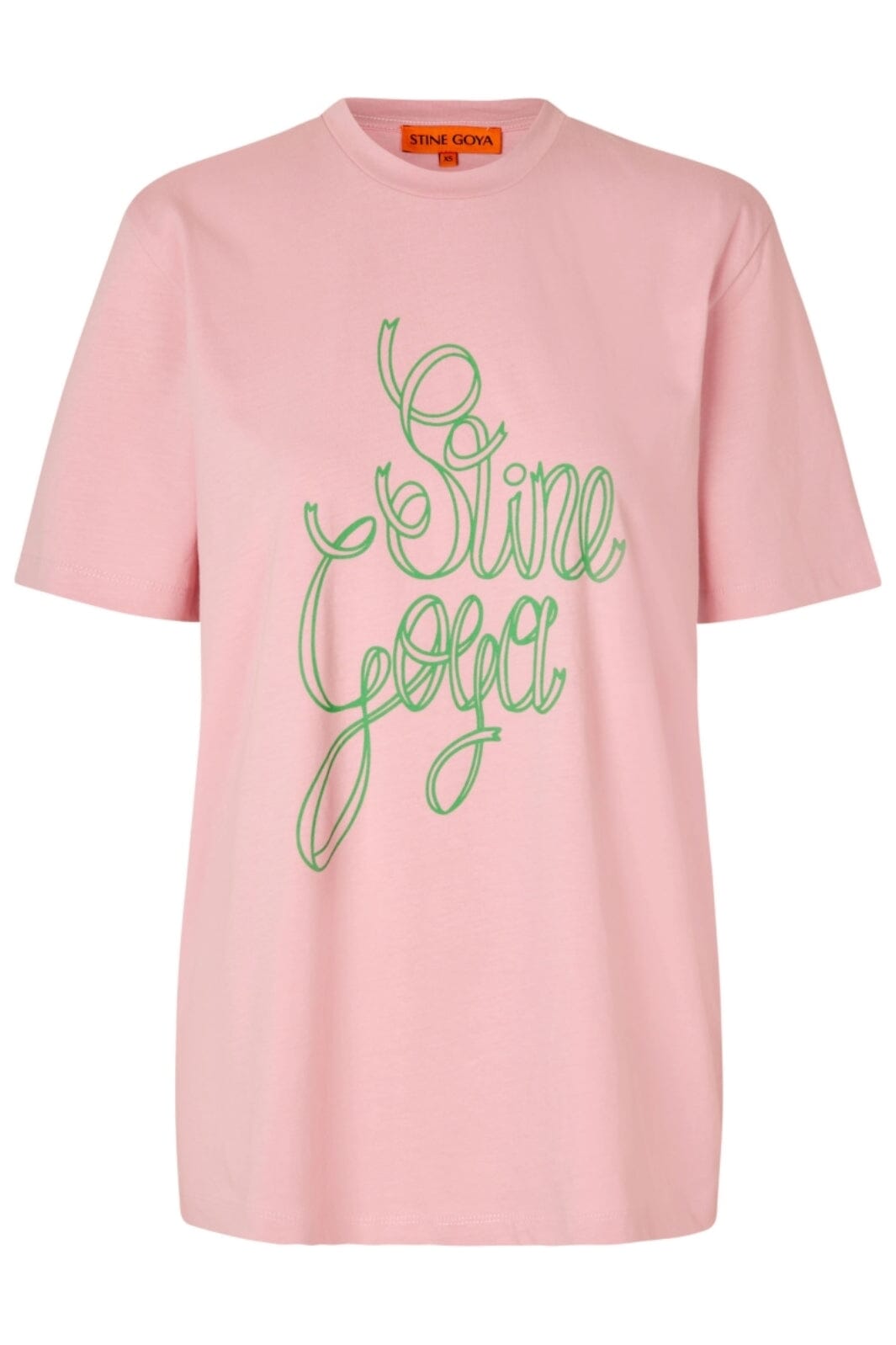 Różowa koszulka od Stine Goya z lekkiego materiału jersey. Ma zielone logo z przodu i okrągły dekolt. Koszulka wykonana jest z ekologicznej bawełny i ma wygodny krój.