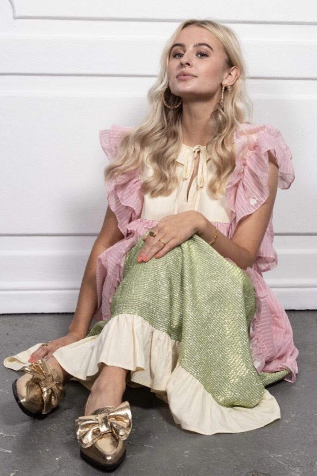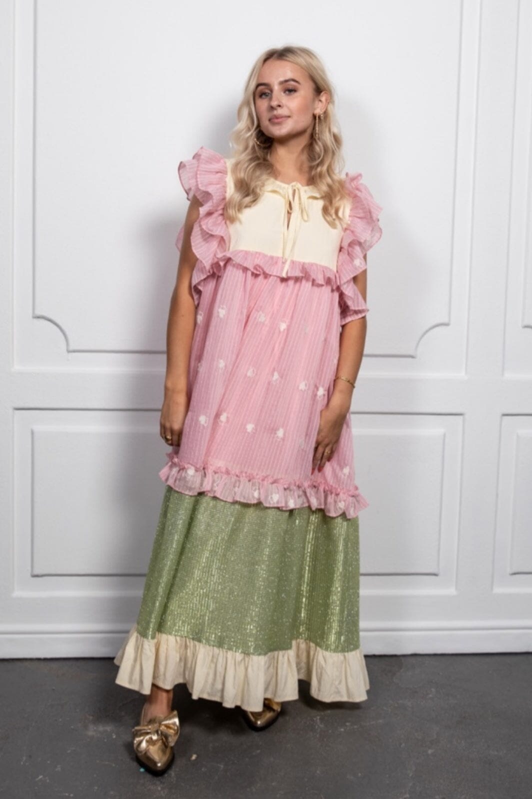 Sukienka na przyjęcie w warstwowym designie z falbanami i wiązaniem. Łączy jasną górę z różową środkową częścią i zielonym, błyszczącym dołem. Sukienka ma luźny krój i długość do kostek.