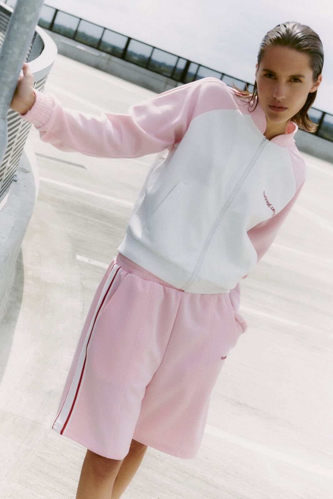 Różowe szorty od The Jogg Concept z białymi i czerwonymi paskami po bokach. Szorty mają luźny krój i elastyczny pas z haftowanymi detalami.