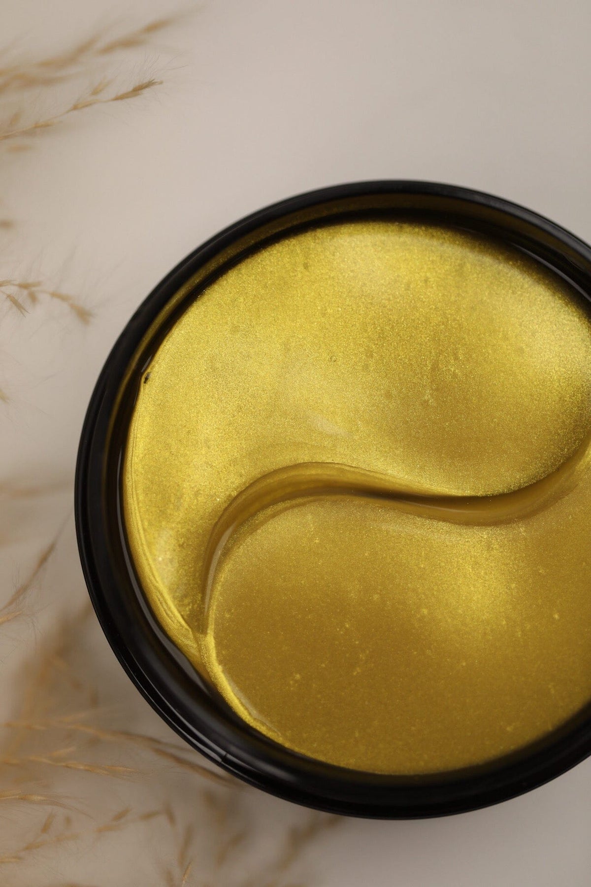 Maski pod oczy Valentin Beautyline w czarnym pojemniku ze złotymi, wygiętymi płatkami. Zmniejszają opuchliznę i cienie pod oczami.