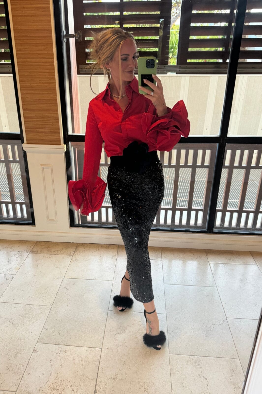 Czarna spódnica od Valentin Studio z cekinami. Ma wysoki stan i sięga do połowy łydki. Cekiny tworzą błyszczący efekt na jednolitym tle.