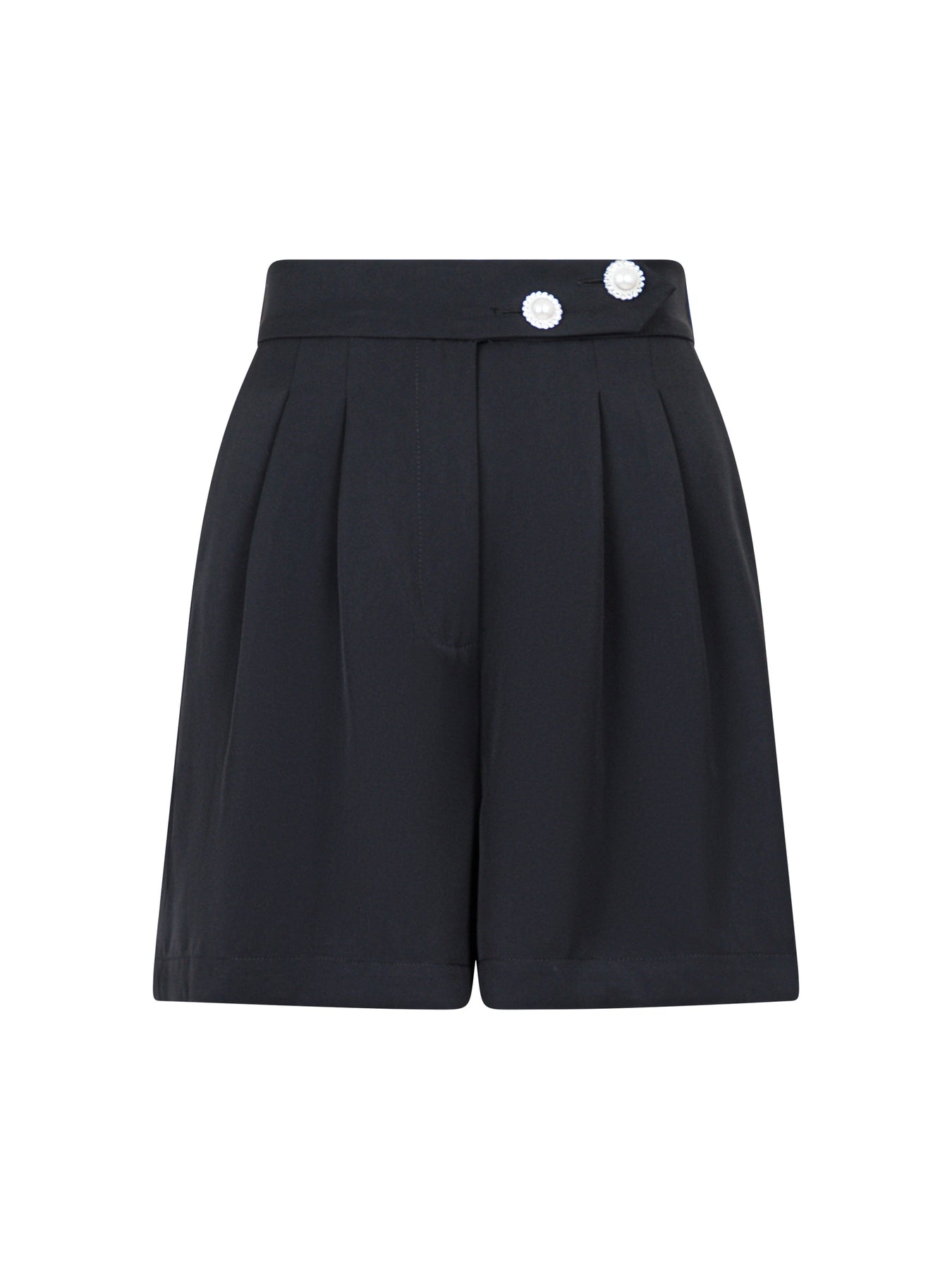Czarne szorty od Valentin Studio z wysokim stanem i luźnym krojem. Szorty mają dekoracyjne detale z pereł i guziki, które nadają projektowi dodatkowego uroku.