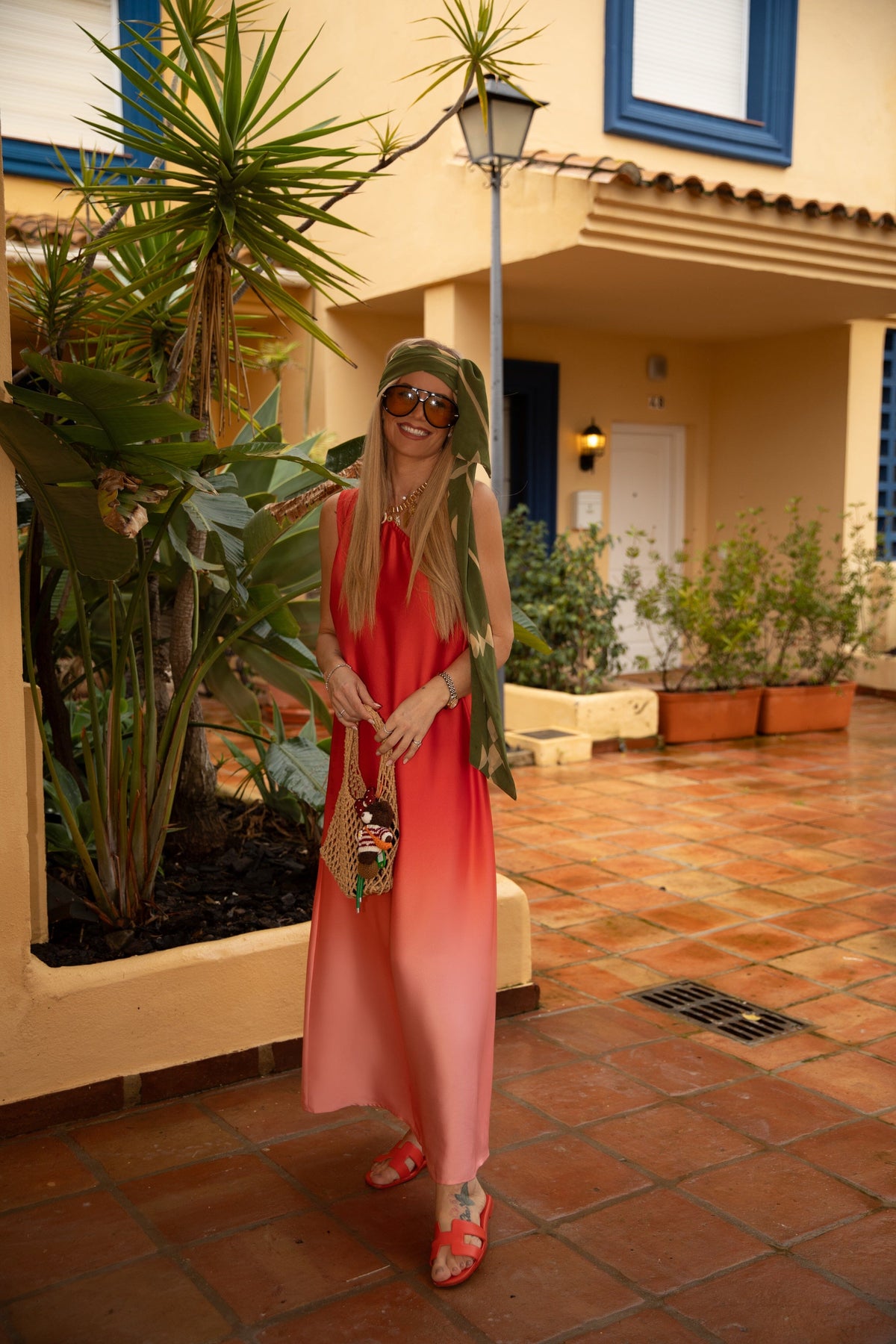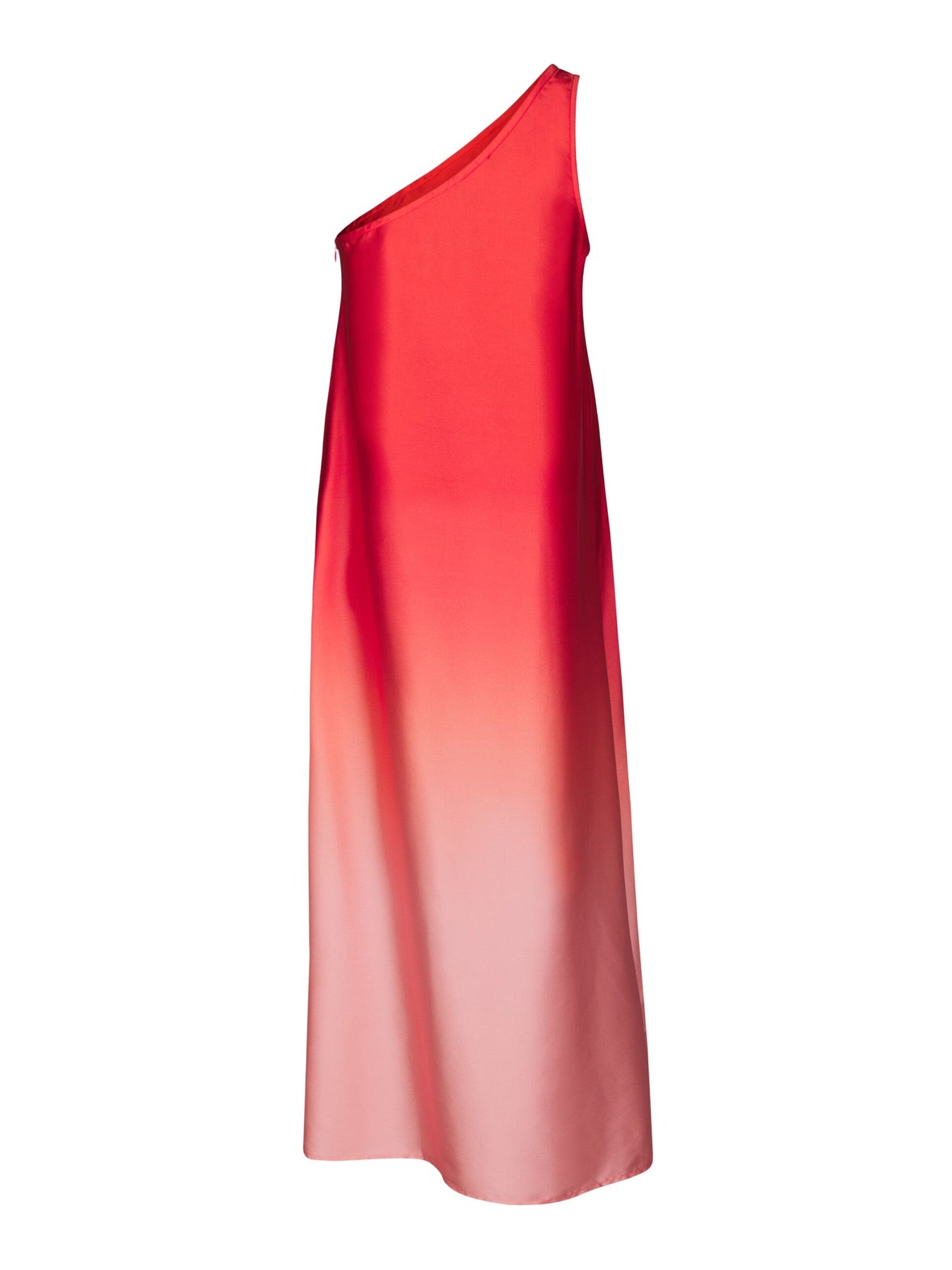 Czerwona sukienka marki Valentin Studio z efektem ombre i fasonem typu off-shoulder. Sukienka sięga do kostek i ma luźny krój.