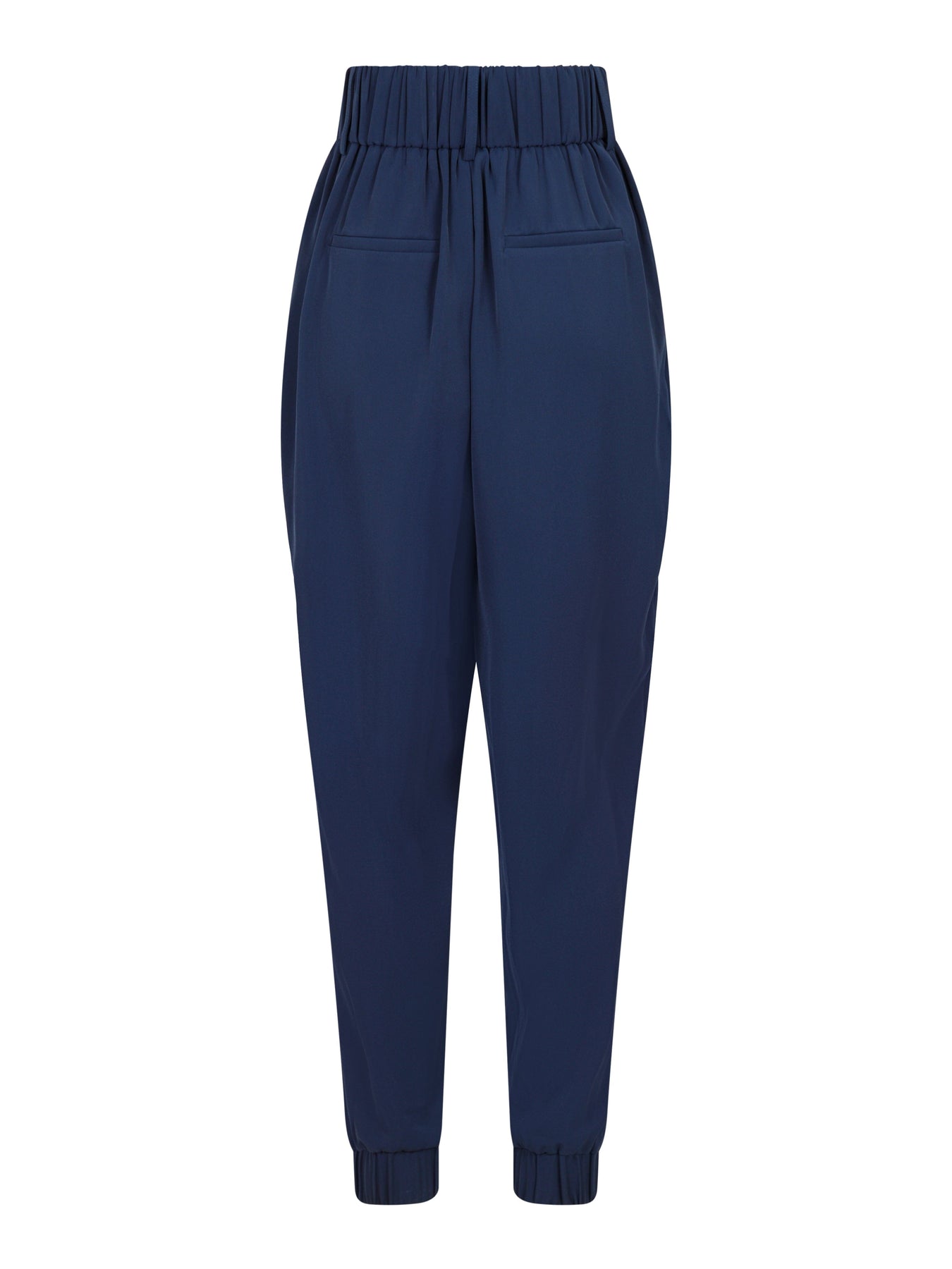 Granatowe spodnie od Valentin Studio z drapowaniami z przodu i gumką w talii. Spodnie mają praktyczne przednie kieszenie i dekoracyjne tylne kieszenie, które nadają im swobodny wygląd.