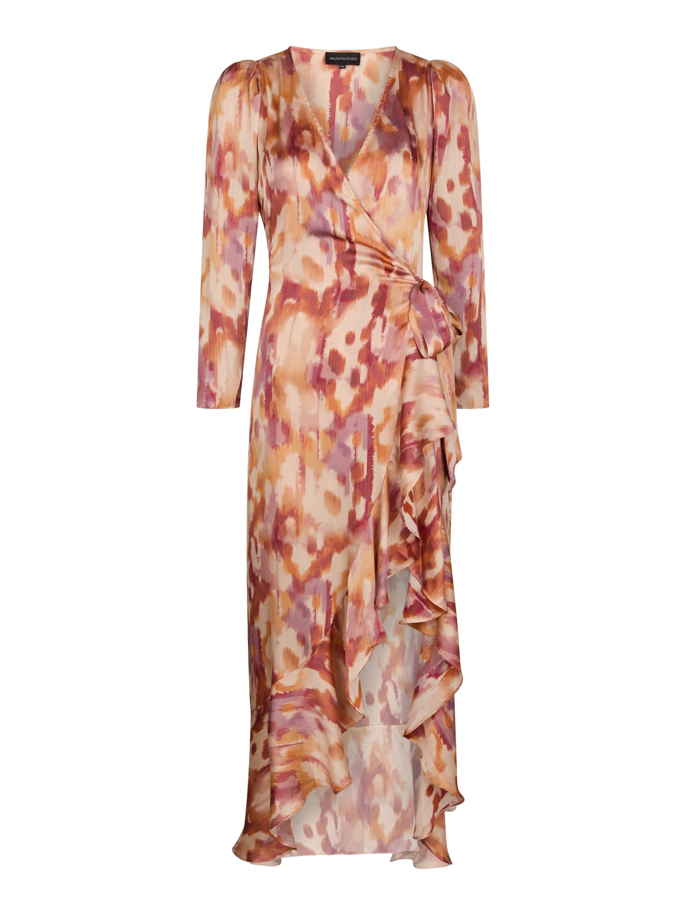 Sukienka od Valentin Studio, wykonana w 100% z poliestru w odcieniu wypalonej pomarańczy. Ta sukienka ma rozmyty wzór w odcieniach czerwieni, pomarańczu i fioletu.
