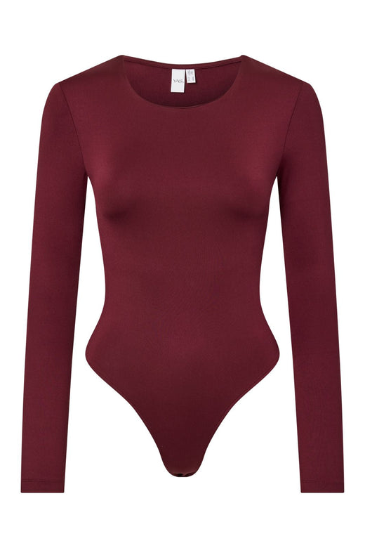 Bordowy body od Y. A.S z materiału jersey z elastanem. Dopasowany model ma okrągły dekolt i długie rękawy, które nadają zakrywający wygląd.