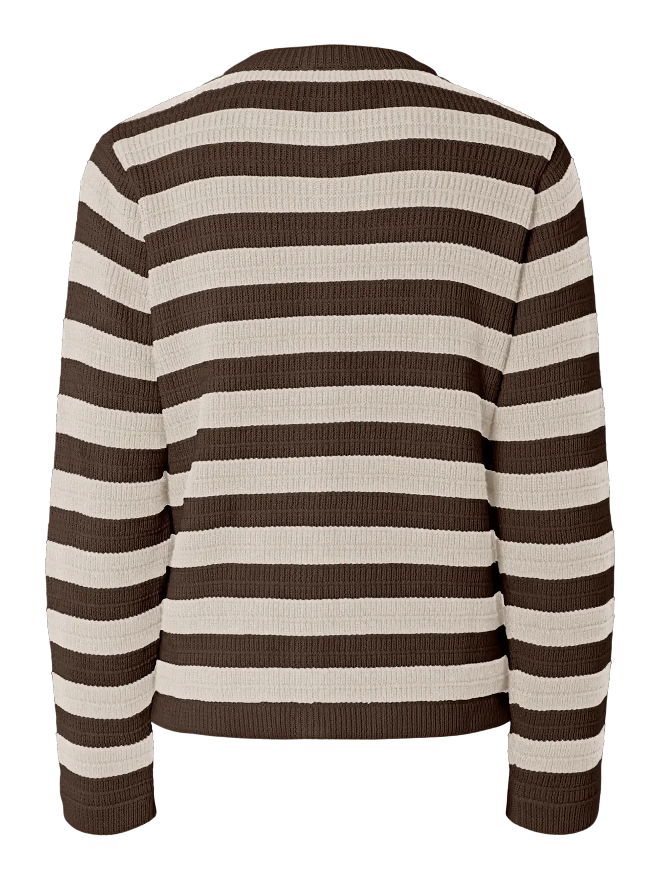 Sweter z dzianiny od Y. A.S w poziome paski w kolorze czekoladowym i beżowym. Ma okrągły dekolt i złote guziki z przodu.