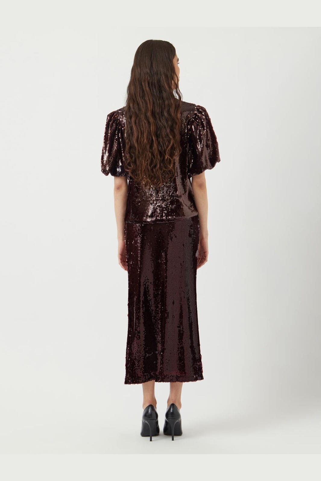 Długa spódnica od YAS, pokryta cekinami w głębokim kolorze burgundowym. Spódnica wykonana jest w 100% z poliestru.